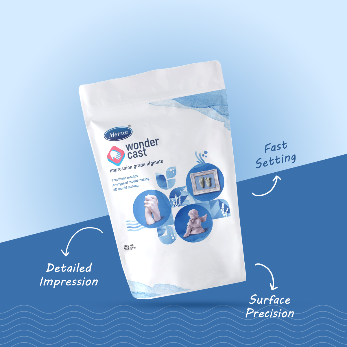 Alginate Impression materials are easy to use, economical and also set fast. This product has a lower water content, steady viscosity and long shelf life. Alginate's fine particle size gives an impression that is surface smooth and thus more identical to the original mould.