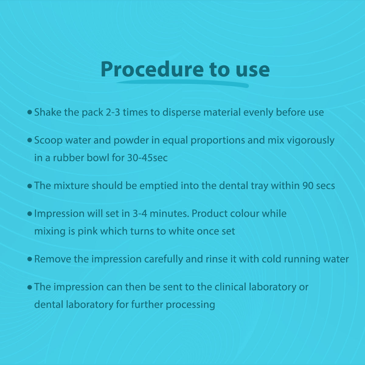 Alginate Dental material is an irreversible hydrocolloid impression material. It can be used for preliminary impressions, provisional crown-and-bridge impressions and opposing dentition impressions. The advantages of using alginate dental powder include a better tolerability on the part of the patient, the ease of manipulation, the short time needed for execution, the instrumentation and the very simple execution technique and possibility of detecting a detailed impression (even in the presence of undercuts) in a single step.