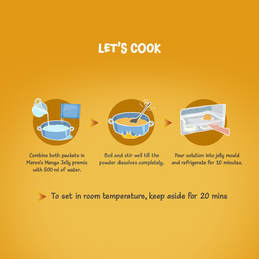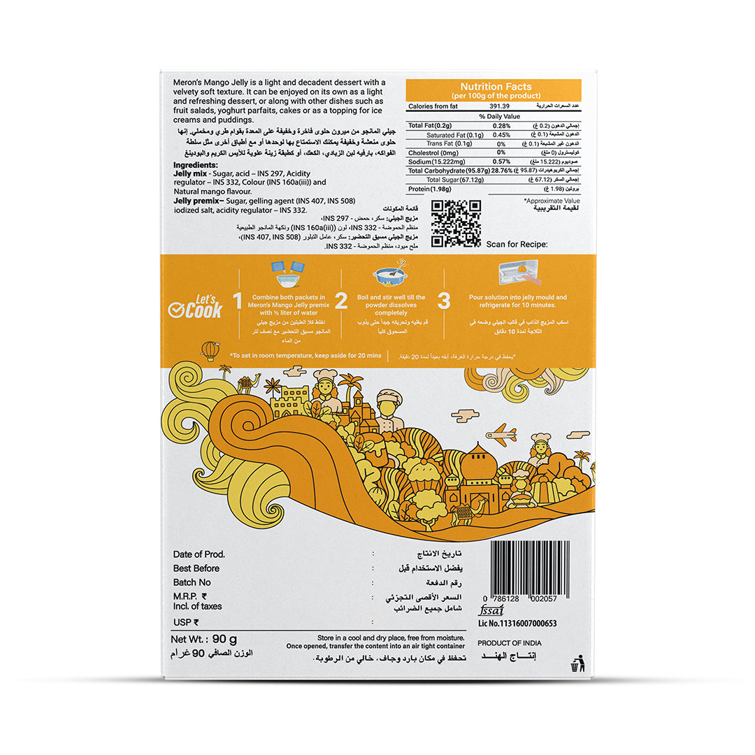 Meron’s mango Jelly is a light and decadent dessert with a velvety soft texture. it can be enjoyed on its own as a light and refreshing dessert or along with other dishes such as fruit salads, yogurt parfaits, cakes, or as a topping for ice creams and puddings (90gms) Available in natural and synthetic
