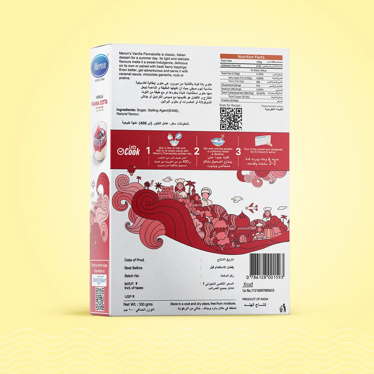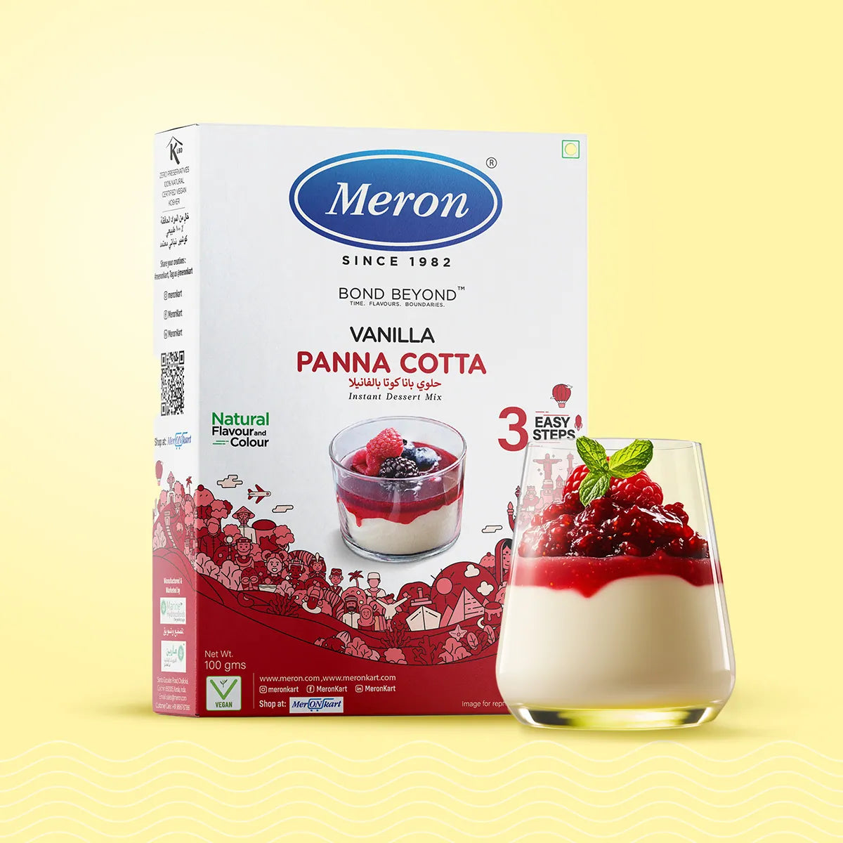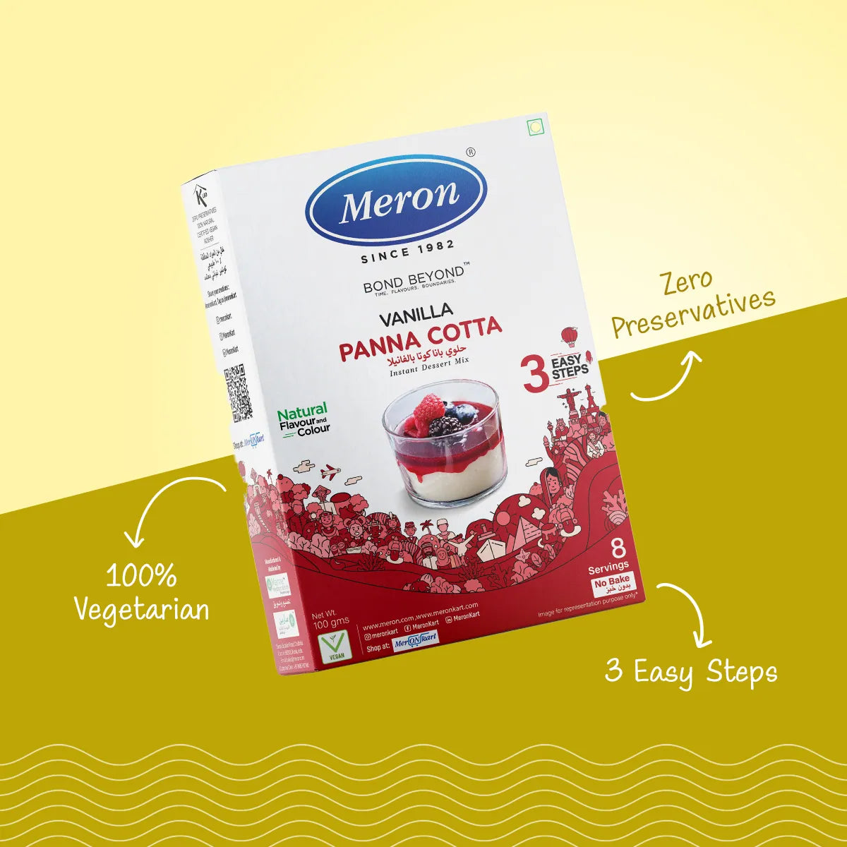 Meron’s vanilla pannacotta is classic, Italian dessert for a summer day. Its light and delicate flavours make it a sweet indulgence, delicious on its own or paired with fresh berry toppings. Even better, get adventurous and serve it with caramel sauce, chocolate ganache, nuts or praline. Store in a cool and dry place, free from moisture
